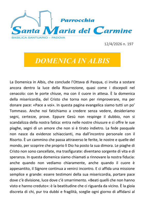 Otto giorni dopo i discepoli erano di nuovo in casa e c'era con loro anche Tommaso. Venne Gesù, a porte chiuse, stette in mezzo e disse: "Pace a voi!". Poi disse a Tommaso: "Metti qui il tuo dito e guarda le mie mani; tendi la tua mano e mettila nel mio fianco; e non essere incredulo, ma credente!". Gli rispose Tommaso: "Mio Signore e mio Dio!". Gesù gli disse: "Perché mi hai veduto, tu hai creduto; beati quelli che non hanno visto e hanno creduto!".